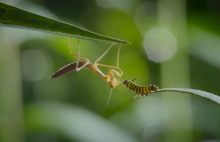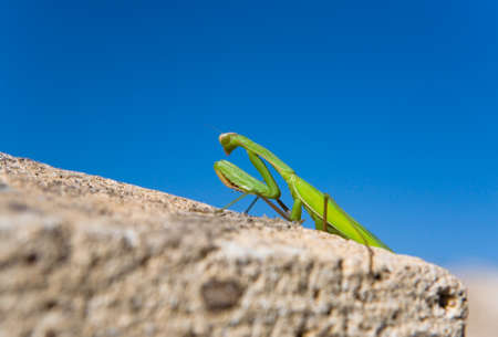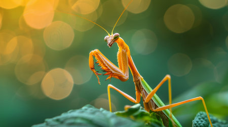 Insect hunter attacks at sunset. Mantis is a terrible monster of wildlife. Mantis in attack.
