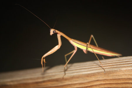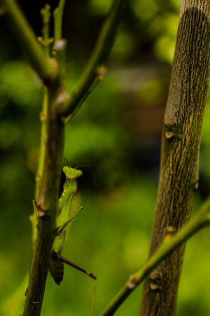 Closeup of Praying Mantis (Arthropoda) standing still on a branch, blurred background.