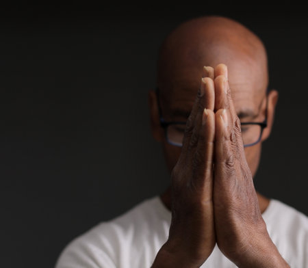 A man on a black background. Hands are folded in the position of prayer. Inner silence.