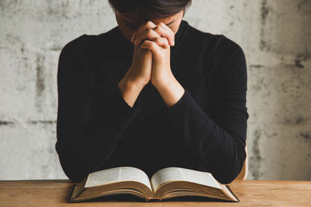 Christian life crisis prayer to god. Woman Pray for god blessing to wishing have a better life. woman hands praying to god with the bible. begging for forgiveness and believe in goodness.