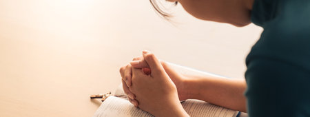 Hands folded in prayer on a Holy Bible in church concept for faith, spirituality and religion, woman praying on holy bible in the morning. woman hand with Bible praying.