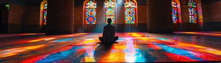 Man sitting in mosque with stained glass light, wide angle, peaceful scene