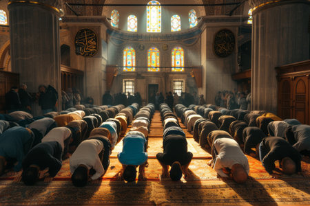 A group of Muslims in a mosque, kneeling in synchronized prayer, showing the unity and discipline of Islamic worship.