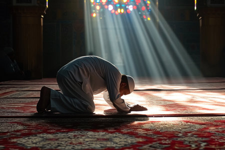 A silhouetted man kneels in prayer inside a grand mosque, positioned directly under dramatic light rays streaming through stained glass windows. The intricate architecture of the mihrab and archways is visible in the shadows. The image evokes a sense of peace, devotion, and spirituality.