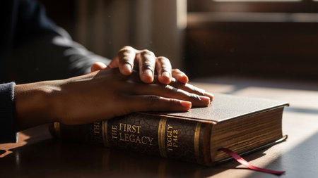 hands are folded in prayer on a Holy Bible .Holy Bible study reading together in Sunday . Generative AI.