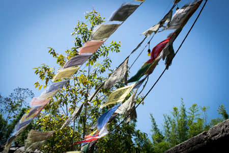 Colorful tibetan prayer flags flapping in the mountain breeze