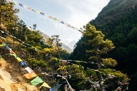 Traditional Prayer Flags Fluttering Against Dramatic Mountain Landscape in Nepal