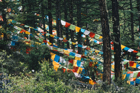 Colorful Tibetan prayer flags in a lamasery
