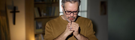 Website banner of man wearing glasses praying with rosary beads clasped in hands, standing indoors with cross on wall in background, eyes closed in moment of reflection