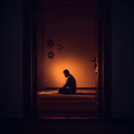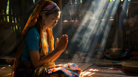 A woman wearing a traditional headscarf is shown in profile, praying with her hands clasped and eyes closed. She is illuminated by a soft, warm light in a dark room, creating a reverent and spiritual atmosphere with dust motes visible in the light beam.
