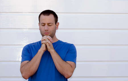 Man praying with white background wearing a blue shirt.