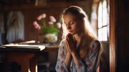 Young beautiful woman with long blond hair in a white dress praying at home