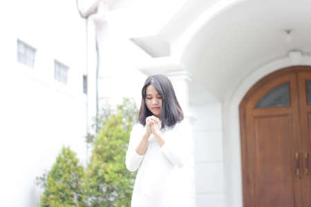 Girl while praying for christian religion with blurred of her body background, Casual woman praying with her hands
