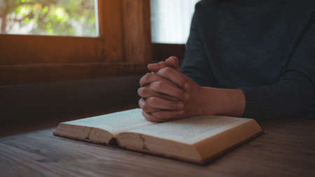 Hands folded in prayer on a Holy Bible in church concept for faith, spirituality and religion, woman praying on holy bible in the morning. woman hand with Bible praying.