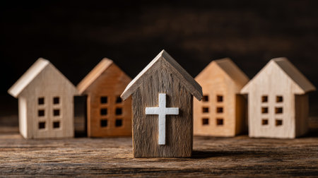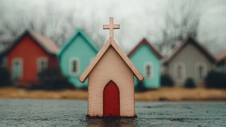 Miniature church model with cross, symbolizing faith and spirituality in a serene setting.