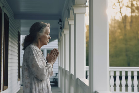 Senior woman praying in backyard at sunset with cloudy sky