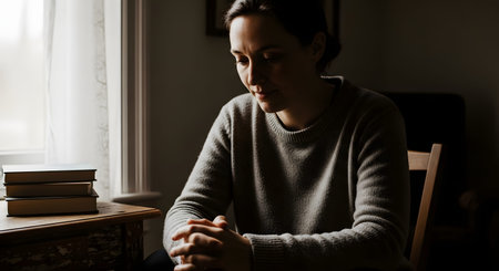 A woman sits with her head bowed and hands clasped in prayer or deep contemplation near a window. A stack of books rests on the table beside her, contributing to the quiet, spiritual, and slightly moody atmosphere.