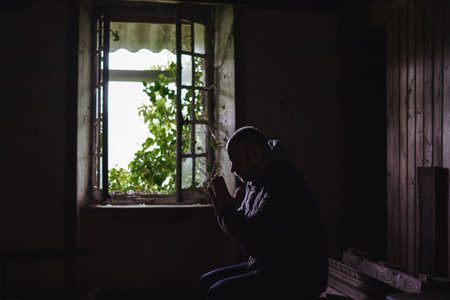 A man prays in an old crumbling house. Abandoned house with an open window from the inside. Hope, despair concept.