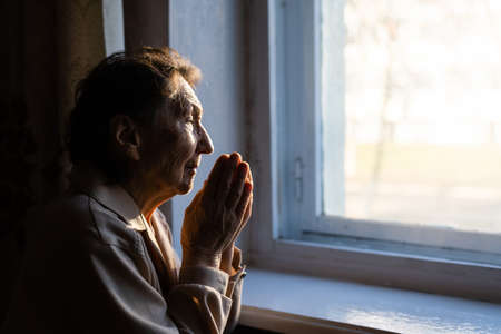 Close up portrait of an old woman praying