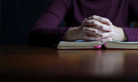 Close-up women christian read bible. Hands folded in prayer on a Holy Bible on wooden table.