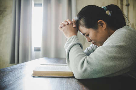 Christian life crisis prayer to god. Woman Pray for god blessing to wishing have a better life. woman hands praying to god with the bible. begging for forgiveness and believe in goodness.