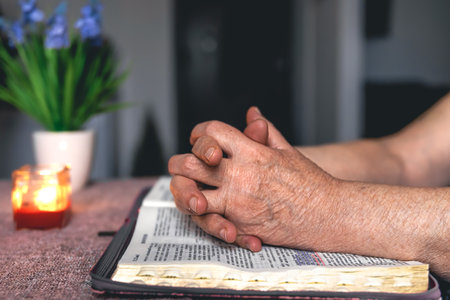 An old woman reads the Bible at home, wrinkled hands close up, copy space.