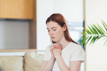 Closeup portrait of a young woman praying sincerely with folded arms at home or indoors. Sincere prayer of a Caucasian girl or female in the church with closed eyes alone. close up at home in the room