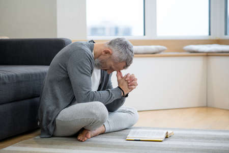 Close up of man with bible praying at wooden desk