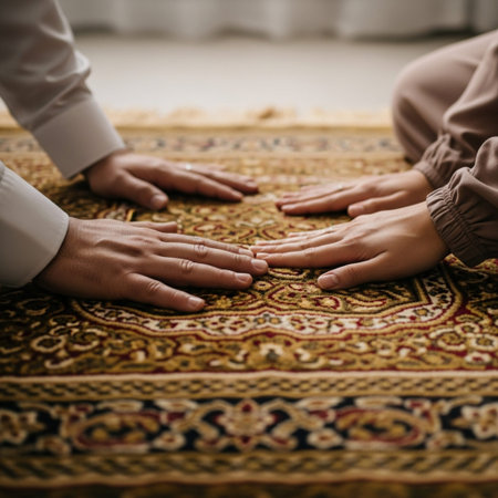 A low-angle shot of a Muslim person's hands rolling out an ornate red and gold prayer rug (sajada) on a sunlit hardwood floor at home. The act is in preparation for Salah, the Islamic daily prayer. The image represents faith, devotion, spirituality, and Islamic tradition.