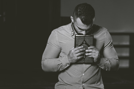 Attractive Muslim Is Kissing The Koran Making Traditional Prayer to God Allah in the Mosque