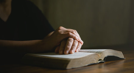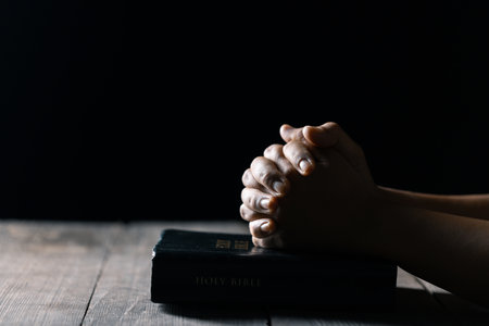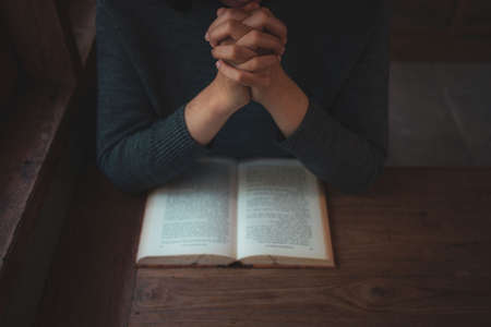 Hands folded in prayer on a Holy Bible in church concept for faith, spirituality and religion, woman praying on holy bible in the morning. woman hand with Bible praying.