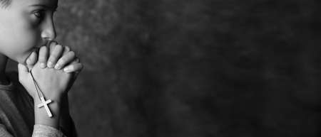 Black and white portrait of little boy with cross praying to God on dark background
