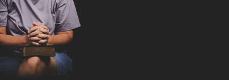 Soft focus on a hand of man while praying for christian religion with blurred of dark background, Casual man praying with his hands together with Bible.