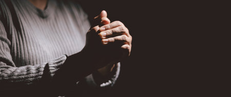 Prayer person hand in black background. Christian catholic woman are praying to god in dark at church. Girl believe and faith in jesus christ. Christ religion and christianity worship or pray concept.