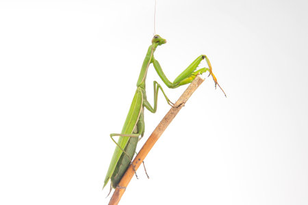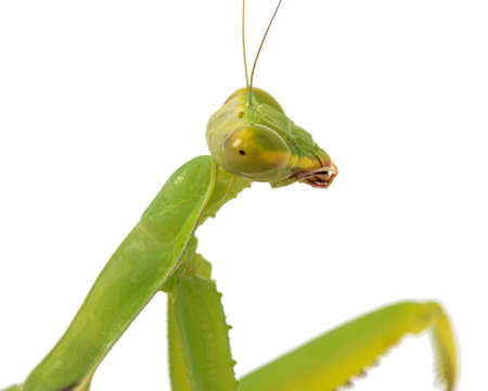 Green color praying mantis against white background, Mantodea order