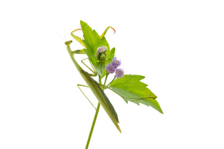 Green mantis isolated on white background sitting on a plant