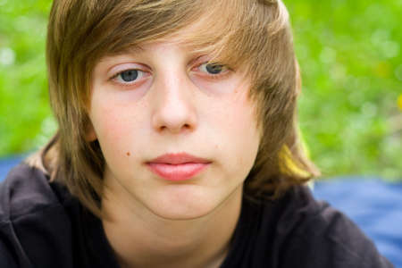 Portrait of a handsome teenage boy with blond hair and blue eyes.