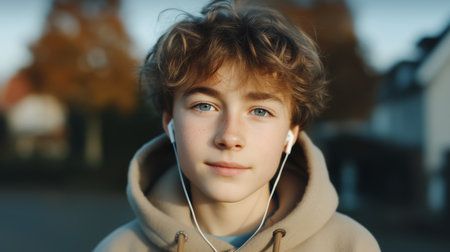Young boy enjoying music through headphones in a cozy autumn outdoor setting Generative AI