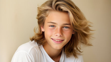 Portrait of a happy smiling blond, long haired confident teenage guy with perfect skin, creamy beige background, banner. Advertising of children's cosmetic products, shampoos and hair care products, medicine, perfumes, cosmetology, courses and trainings