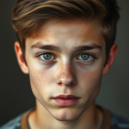 A young boy from Russia gazes directly at the viewer with captivating grey eyes. His tousled hair frames his face and he wears a cozy casual clothes. Rosy cheeks, piercing serious look. Generative AI