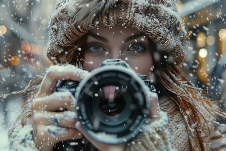 Cheerful girl photographer takes pictures of winter in a snowy park