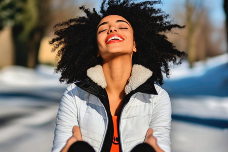 Joyful woman with curly hair opening winter outdoors with bright smile.