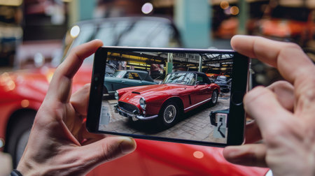 Smartphone capturing a classic red convertible car in a vintage automobile exhibition.