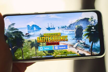 Los Angeles, California, USA - 17 December 2018: Hands holding a smartphone with PUBG FPS game