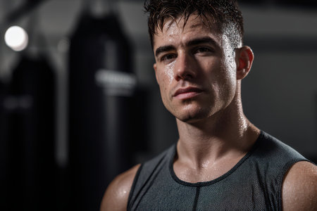 Young man with wet hair and a sweaty face in a sleeveless workout top, standing indoors with defocused dark punching bags in the background, creating a moody gym atmosphere