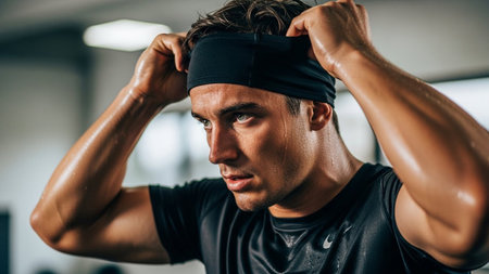 Close-up of a determined athletic man adjusting his black headband and wiping sweat from his face after a strenuous gym workout, showcasing dedication and effort.