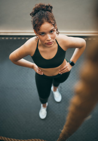 Rope climbing, gym and fitness of woman ready for sports challenge, full body workout and training workout. Female athlete, portrait and climb exercise with focus, strong mindset and goal motivation