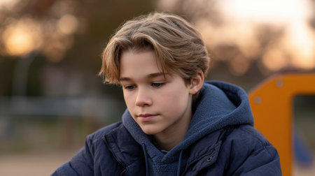 A young boy sits quietly in a playground, lost in his thoughts during the warm glow of sunset. This image captures a moment of deep reflection and tranquility amidst nature.
