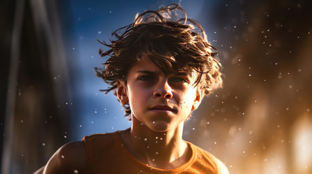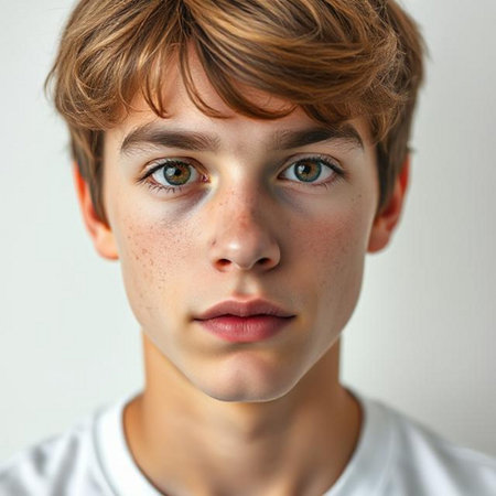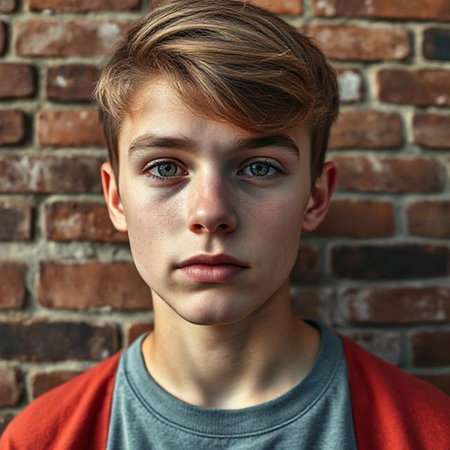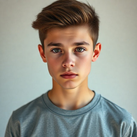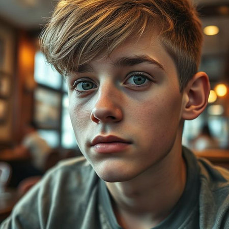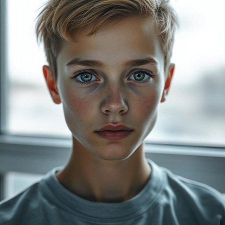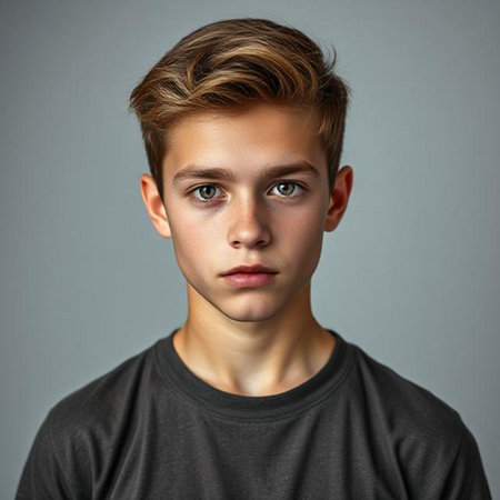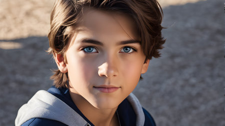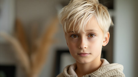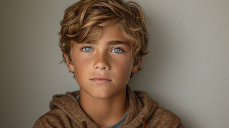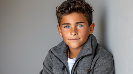 A young boy from Russia gazes directly at the viewer with captivating grey eyes. His tousled hair frames his face and he wears a cozy casual clothes. Rosy cheeks, piercing serious look. Generative AI