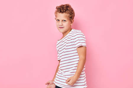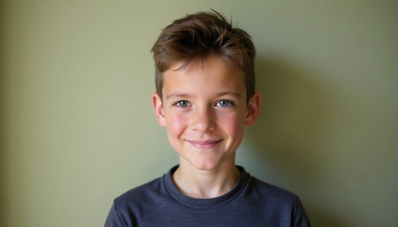 A young boy stands confidently, wearing a simple gray t-shirt and radiating happiness.